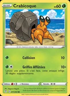 Vous possédez la carte Crabicoque #011 de Rivalités Destinées ? Nous la rachetons jusqu'à 0.00€ selon son état. Notre plateforme de rachat de cartes Pokémon vous permet de vendre vos cartes rapidement et en toute sécurité. Même les cartes communes ont de la valeur, surtout si vous en possédez plusieurs. Regroupez vos cartes pour optimiser les frais d'envoi et maximiser votre gain. Recevez une offre de rachat personnalisée en 10 minutes chrono.